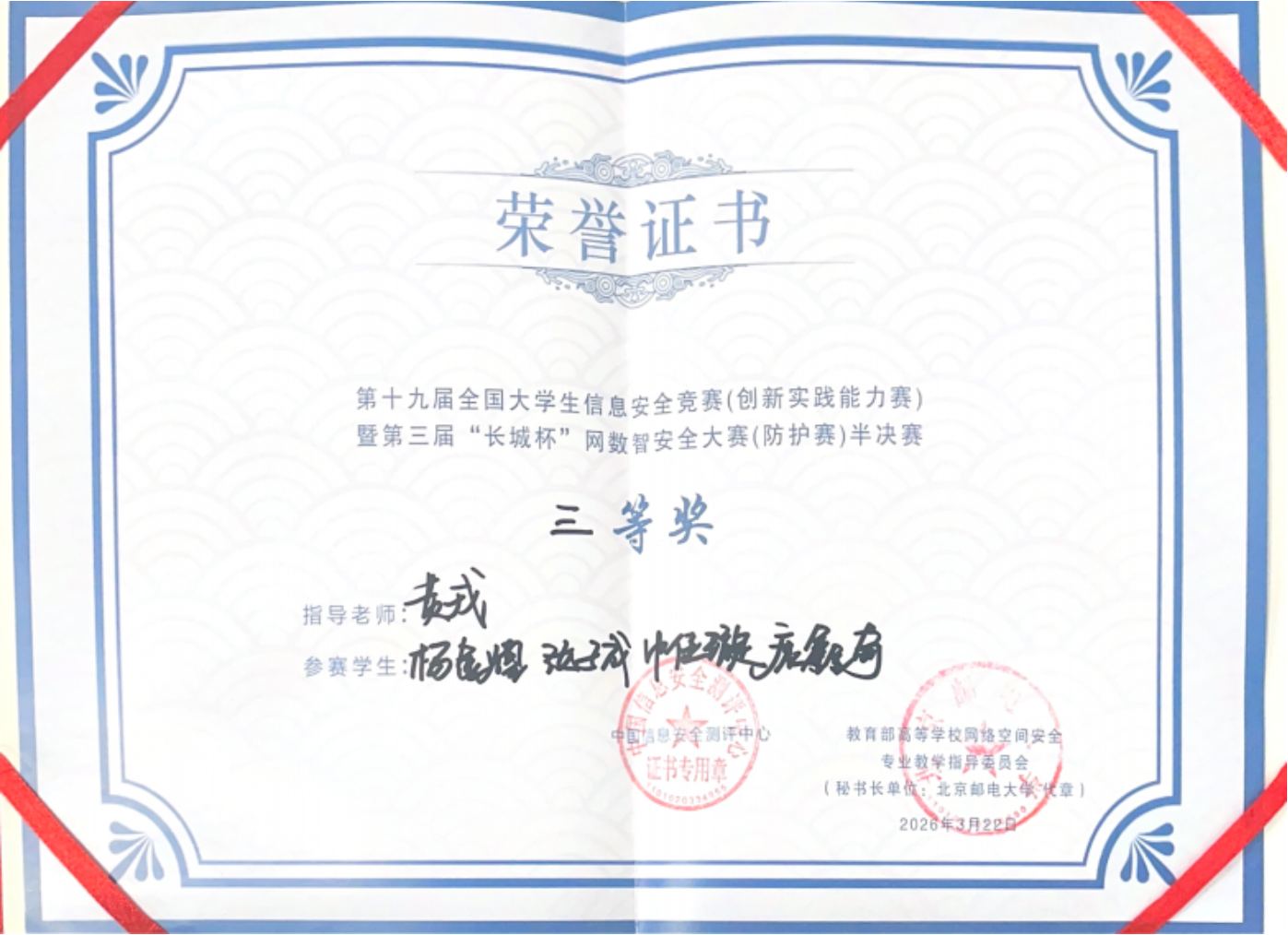 近日,第十九届全国大学生信息安全竞赛(创新实践能力赛)暨第三届“长城杯”网数智安全大赛(防护赛)半决赛(辽宁赛区)落下帷幕。本届赛事共吸引全国804所高校、4150支队伍、万余名师生参赛,规模创历届新高。18禁视频 18禁视频 1nfoNCE战队在指导老师黄戎带领下,队员杨金煌、申佳璇、汝子成、康鑫奇协同作战,荣获省级三等奖。